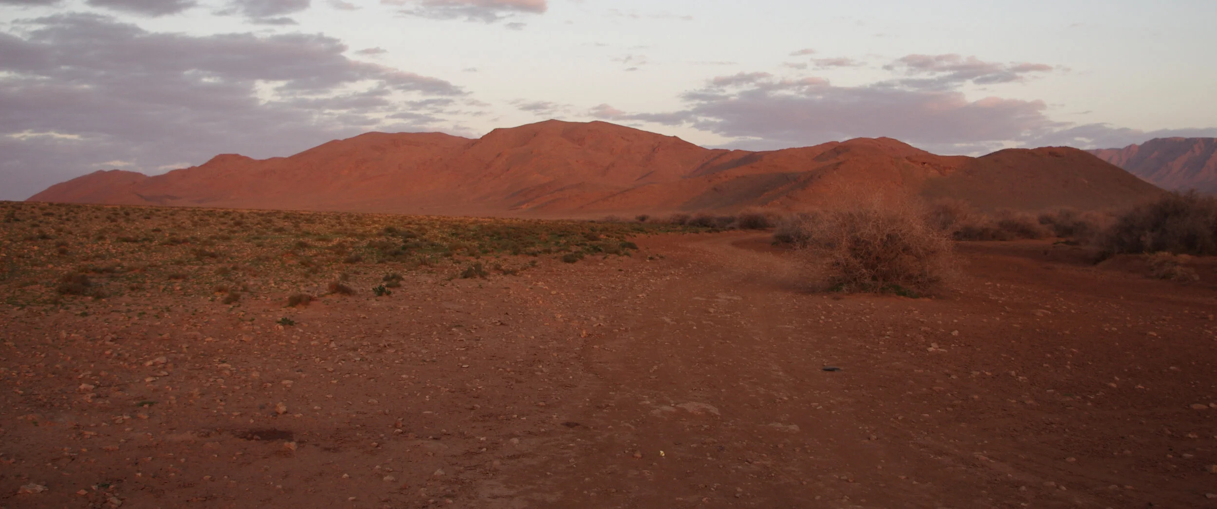 We arrived at one of these more vibrant areas at sunset and pitched our tents amongst some bushes in the long shadows of a sandy bank of earth. Waking just before sunrise I climbed up to its summit to see the landscape in the first light of the day. We were at the edge of a great pattern of red, sandy mounds fused with vivid green shrubs.